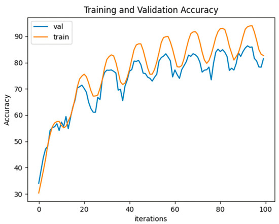 Figure 7 shows the accuracy of the proposed method during training and validation. The initial accuracy for training was 30% but increased to 82%. Similarly, the validation accuracy was 34% but reached approximately 81.5% after 100 epochs. However, the highest validation accuracy 86.4% was achieved after 93 epochs. Based on these results, it was assumed that overfitting occurred during the training process, leading to training results up to epoch 90 as the optimal model. Therefore, it was verified that the proposed method with augmented features helps learn experts’ control patterns through cyclic shifts and dynamic object arrangement, thereby increasing accuracy.