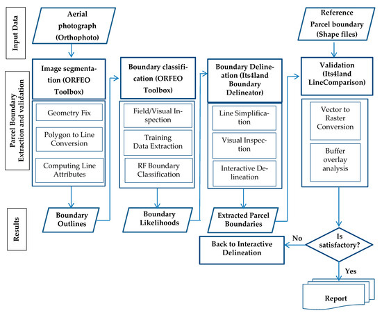 Thus, this study proposed publicly available and ready-to-use open-source software tools for each process pursuant to previous studies. It also outlines a workflow to apply the proposed software solutions and demonstrates the outstanding role of the AFE approach for fast, affordable, and reliable cadastral mapping. After open-source tools and plugin identification, the implementation process of the AFE approach is performed sequentially, starting with image segmentation followed by boundary classification, interactive delineation, and validation of interactively extracted boundaries relative to a reference cadastre, as depicted in Figure 3.