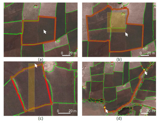 Examples of the interactive delineation functionalities: (a) connect lines surrounding a click, or (b) a selection of lines. (c) Close endpoints of selected lines to a polygon. (d) Connect lines along least-cost path [60]. The mouse pointer arrows show where to click to initiate the desired actions.