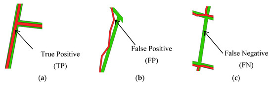 The QGIS “LineComparison” plugin developed by the Its4land project was employed for the buffer overlay accuracy assessment of the interactive delineation result. It requires first rasterizing and buffering the reference dataset (Figure 5, Green) and overlaying it with the interactively delineated boundary lines (Figure 5, Red). Thus, the number of correctly extracted (True Positive (TP)) (Figure 5a), incorrectly retrieved (False Positive (FP)) (Figure 5b), and missing (False Negative (FN)) (Figure 5c) boundary features was used to statically compute the completeness, correctness, and quality of the interactive delineation result.