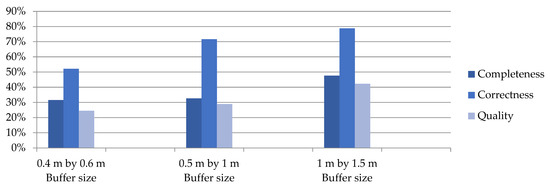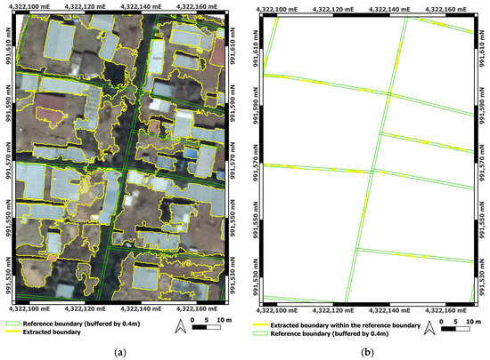Studies have used different radius buffer sizes for the extracted and reference boundary lines for buffer overlay analysis. Crommelinck et al. [51] used a 30 cm buffer size for validating automatically extracted and interactively delineated cadastral boundaries from UAV datasets for both rural and peri-urban areas in Rwanda and Kenya. Fetai et al. [4] performed the accuracy assessment with buffer widths of 0.25, 0.50, 1.0, and 2.0 m for cadastral boundaries extracted from UAV images. Wassie et al. [16] used 0.5, 1.0, and 2.0 m buffer radii to validate automatically extracted boundary lines from high-resolution satellite images for rural areas of Ethiopia. A study for the FFPLA implementation model suggested 1 m accuracy for rural area cadastral mapping from an orthophoto of 0.3 m resolution [72].