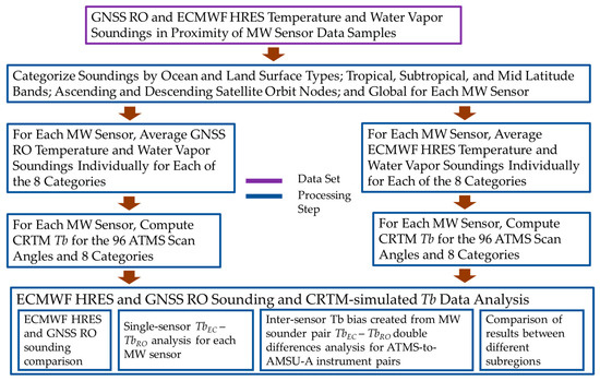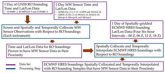 The flows of processing and analysis of the GNSS RO and ECMWF HRES temperature and water vapor soundings collocated at MW sensor data samples.
