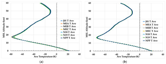 Mean of ECMWF HRES and GNSS RO sounding temperatures averaged over the region between 60°S and 60°N for all collocations with NPP and N20 ATMS and N18, N19, MEA, MEB and MEC AMSU-A are shown for (a) 1 January and (b) 1 July 2020. Note that the y-axis label “MSL Altitude” denotes Mean Sea Level Altitude.