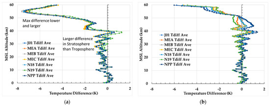 Difference in ECMWF HRES and GNSS RO sounding temperatures averaged over the region between 60°S and 60°N for all collocations with NPP and N20 ATMS and N18, N19, MEA, MEB and MEC AMSU-A are shown for (a) 1 January and (b) 1 July 2020. Note that the y-axis label “MSL Altitude” denotes Mean Sea Level Altitude.