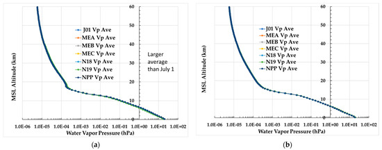 Mean of ECMWF HRES and GNSS RO sounding water vapor pressure values over the region between 60°S and 60°N for all collocations with NPP and N20 ATMS and N18, N19, MEA, MEB and MEC AMSU-A are shown for (a) 1 January and (b) 1 July 2020. Note that the y-axis label “MSL Altitude” denotes Mean Sea Level Altitude.