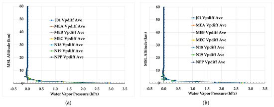 In Figure 5a,b, similar plots associated with the ECMWF HRES and GNSS RO sounding water vapor pressure values are presented. These figures show a drop-off of water vapor pressure from about 20 hPa near the surface to 0.2 hPa at 9 km. Above 9 km, it drops about another order of magnitude by about 12 km. Also, the peak water vapor pressure near the surface is about 1–2 hPa larger on 1 January 2020 than 1 July 2020. The difference between the ECMWF HRES and GNSS RO sounding water vapor pressure averaged over the same region and days is shown in Figure 6a,b. These figures show that the differences are smaller near the surface in July compared to January. Also, the variability between instruments is only about 10%.