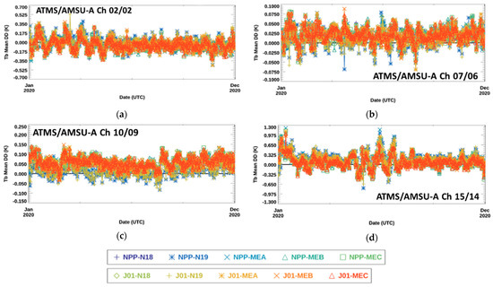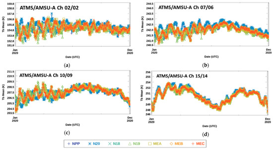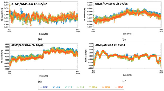 Time series of daily global-average SS CRTM-simulated Tb difference, , associated with near-nadir ISA 49 for ATMS/AMSU-A (a) Ch 2/2, (b) Ch 7/6, (c) Ch 10/9, and (d) Ch 15/14 between 1 January 2020 and 31 December 2020. The legend identifying each satellite in the plots is at the bottom of the figure.