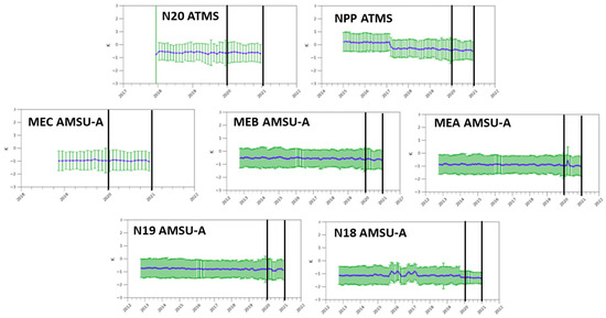 The global monthly mean (blue curve) and 1-σ standard deviation (green lines) O-B Ta bias time series for ATMS Ch10 from N20 and NPP (top row) and AMSU-A Ch9 from MEC, MEB, and MEA (middle row) and N19 and N18 (bottom row) taken from the STAR Integrated Cal/Val System (ICVS) web site (https://www.star.nesdis.noaa.gov/icvs/ (accessed on 16 August 2023)). The data from 2020 are between the two black vertical lines shown on each plot.