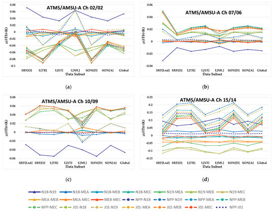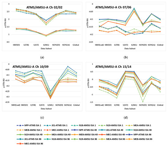 The values all for surface type, latitude and satellite orbit node DS identifier classes for near-nadir ISA 49. The sub-figures represent ATMS/AMSU-A Ch (a) 2/2, (b) 7/6, (c) 10/9, and (d) 15/14. The legend identifying each satellite pair in the plots is at the bottom of the figure.