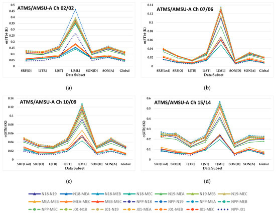 Figure 13a–d are similar to Figure 11a–d, except that they represent the time series data standard deviation, , instead of the mean, . One feature that is apparent in all figures is a separation between plot groups with smaller and larger . The smaller values are associated with the ISA 49 near-nadir scan angle, while those with larger are derived from ISA 1 and ISA 96 scan angles of ±52.725°. Another anomaly that is present is that the L[ML] region has larger by between 25% and 400% than other regions. The mid-latitudes lie between the poles and tropics. The polar length of day seasonally varies between 0 and 24 h and its surface receives weak or no insolation, while the tropics have nearly 12 h of daylight per day with strong surface insolation all days of the year. This creates meteorological features with pronounced thermal and water vapor spatial and temporal structure variability in the mid-latitudes that represent sharp boundaries between polar and tropical air masses. One final feature to note is the higher values in the L[TR] region for ATMS/AMSU-A Ch 10 and 15/Ch 9 and 14. This increase in may be due to ionospheric variability in the tropical mesosphere which is completely neglected by the GNSS RO algorithm that transforms RO refractivity data into atmospheric temperature.
