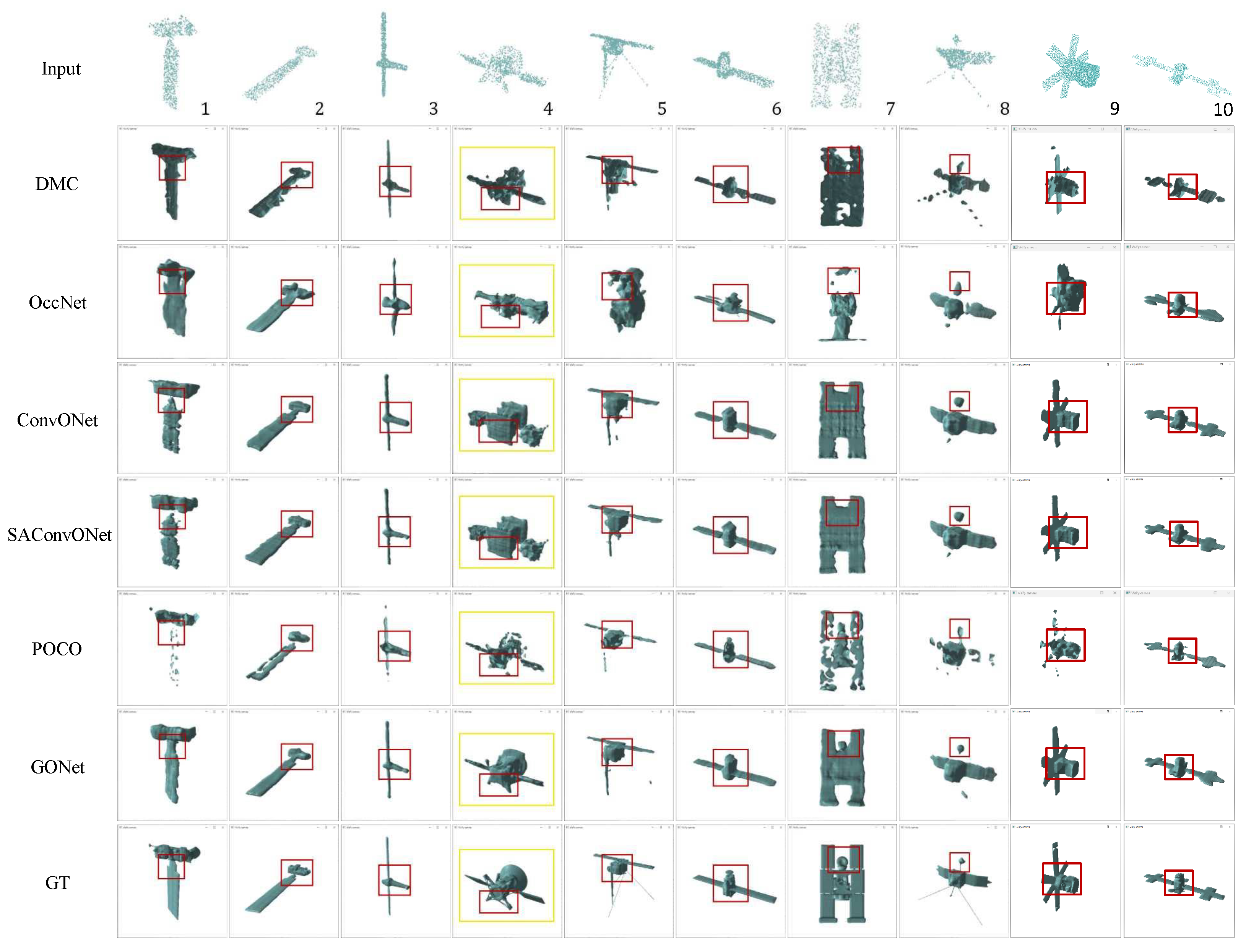 | Metrics | PSGN | DMC | OccNet | POCO | ConvONet | SAConvONet | GONet | |