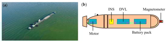 The field experiment was conducted in an experimental reservoir in Hebei Province, which is undeveloped and far away from artificial construction. The intensity of the local geomagnetic field approximates the IGFR 2012 values monitored with a proton magnetometer. A 200 m caliber UUV with a non-magnetic aluminum alloy shell was used for the experiment, and its main construction is shown in Figure 2. A triaxial fluxgate magnetometer is used to detect the magnetic signal. To minimize stray magnetic fields generated by the motor system installed in the tail and interference from the battery pack, the magnetometer was mounted in a plastic watertight cabin extending from the head of the UUV. Additionally, a Doppler Velocity Log (DVL) and an Inertial Navigation System (INS) were served as the velocity sensor while functioning as the attitude sensor within the UUV, respectively.