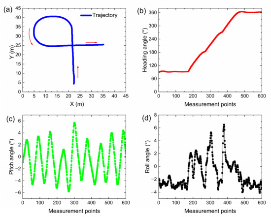 To reduce errors in the measured data, the UUV navigated at various headings, pitches, and roll angles whenever possible. Thus, it was controlled to sail along a typical circular trajectory submerged to a depth of 1.5 m underwater. The diameter of this trajectory was minimized to ensure a nearly constant intensity of the geomagnetic field. The underwater geomagnetic total field strength was measured at the center of the trajectory with a proton magnetometer and was found to be 53,975 nT, which was used as the true value for estimating compensation parameters. Before the field experiment, the magnetometer was calibrated with the method introduced in [34]. After calibration, measurement error was reduced from 43 nT to less than 1.2 nT. Moreover, the UUV sailed along a straight line to ensure the proper operation of the measurement system in the pre-experiment. The entire trajectory of the UUV is illustrated in Figure 3a and the attitude angles measured by the INS are shown in Figure 3b–d.