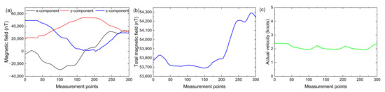 The measurement results at 2.1 knots: (a) magnetic-field components; (b) total magnetic field; and (c) actual velocity of UUV.