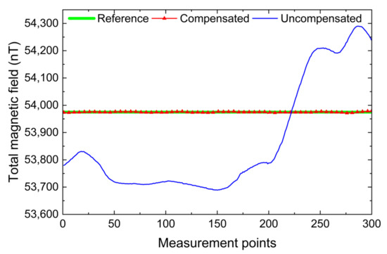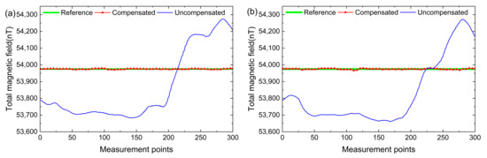Finally, these parameters were used to compensate for the interference magnetic field. As demonstrated in Equation (10), the different attitudes of the UUV have no effect on the compensation of the total magnetic field.