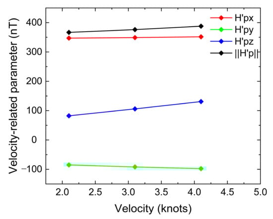 The estimation results for different velocities reveal that exhibits significant variation, while remains nearly constant. Minor variations are believed to be caused by the non-uniformity of the magnetic field along the circular trajectory, with primarily determined by inherent characteristics of the measurement system based on UUV, such as the magnetization coefficient of the soft magnetic material. Figure 7 provides the fitting results by the linear model based on the values at the velocities of 2.1, 3.1, and 4.1 knots.