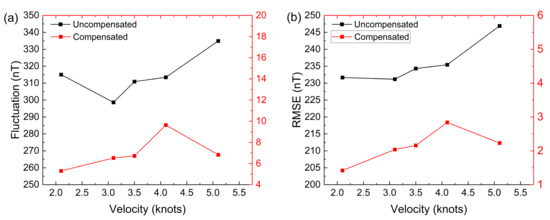 After compensation, both the fluctuation and RMSE remained at high levels (Table 6). This indicates that this compensation method is not applicable for compensating interference when the velocity of the UUV varies.