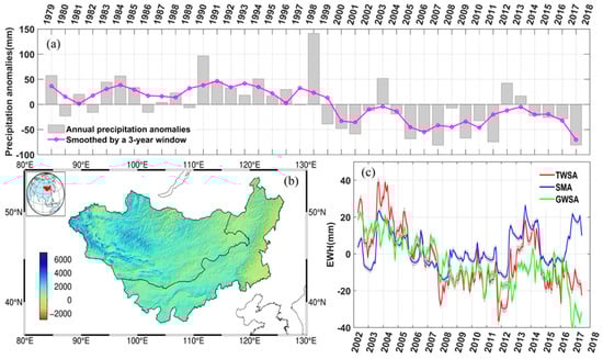Precipitation anomalies during 1979–2017 and TWSA during 2002–2017 on the Mongolian Plateau. (a) the precipitation anomalies deviate from the average over the whole period. The red curve in the upper plot is smoothed by 3 years. (b) the location of the Mongolian Plateau (red area) and its main topographic features. (c) changes in TWSA and its major components.