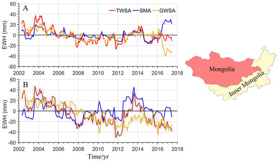 We examined the variations in the TWSA of Mongolia and Inner Mongolia (Figure 2). The long-term changes of TWSA in Mongolia and Inner Mongolia shows significant differences during variable periods. For example, during 2002–2017, the linear trend of TWSA in Mongolia was −1.44 ± 0.56 mm/year (Figure 2A), and the TWSA decline rate of Inner Mongolia was 3.4 ± 0.78 mm/year (Figure 2B), which was higher than that in Mongolia.