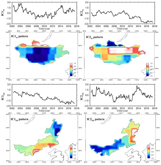 In Mongolia, the leading mode (IC1M) is the annual mode, which explains 75.5% of the total variance of the filtered TWSA time series, followed by the trend mode that explains 14.6% of the total variance. As shown in Figure 3, the spatial weight of IC1M shows a positive contribution to the corresponding time function in northern Mongolia and the spatial pattern of the IC1M model shows a gradual increase in water storage toward the northwest. The spatial weights of IC2M reflect the transition of the TWSA from northwest to southeast, with positive responses in central Mongolia and negative responses on the northwest tip and southeast side of Mongolia.