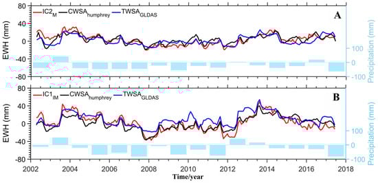 Time series of precipitation and water storage changes in Mongolia and Inner Mongolia. (A) Comparison of annual precipitation anomaly (cyan bar), CWSAHumphrey (black curve), and TWSAGLDAS (blue curve) in Mongolia with IC1M (red curve). (B) Comparison of annual precipitation anomaly (cyan bar), CWSAHumphrey (black curve), and TWSAGLDAS (blue curve) in Inner Mongolia with IC2IM (red curve).