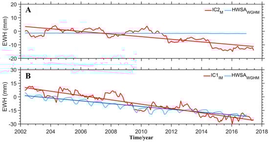 (A) comparison of monthly IC1M and HWSAWGHM time series in Mongolia. (B) comparison of monthly IC2IM and HWSAWGHM time series in Inner Mongolia. The red and cyan lines show the linear trend.