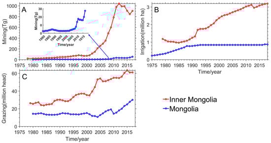 We obtained grazing data (number of sheep and goats, 1979–2017), mining data (coal production, 1979–2017), and agricultural data (area of irrigated croplands from 1979 to 2017), with a temporal resolution of 1 year, documented from the Inner Mongolia Statistical Yearbook []. For Mongolia, those data were obtained from the Food and Agriculture Organization of the United Nations database (faostat.fao.org) and the United States Energy Information Administration (www.indexmundi.com/ (accessed on 1 March 2022).