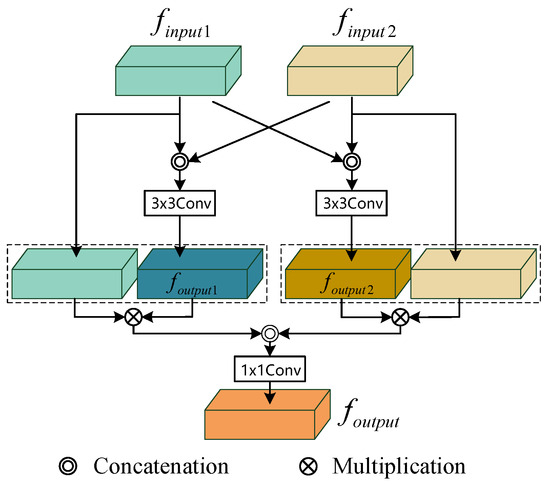 Suppose and are the two input features of the global semantic module, and the input size is . First, to better detect the change in semantics, and are cross fused and dimensionally reduced through convolution to obtain output features and , and the size of the output feature map is . Then, and are fused by weighting, and and are fused by weighting so that the fused features overcome the difficulties of different characteristics of a single image. This way, the bi-temporal semantic information extracted by the network is more representative and instructive, which enhances the network’s ability to distinguish the change area. Finally, we perform a concatenation operation on the fused features and use convolution for deep feature extraction to further extract semantic change information and refine it, obtaining the output feature map , and the size of the output feature map is . The following formula may be used to explain the aforesaid procedure’ calculation: