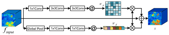 Assume the size of the input feature map is . Firstly, in the spatial dimension , it goes through an convolution, which compresses the feature channel number to 1, obtaining the feature map, which then goes through two convolution layers to extract feature information, followed by sigmoid activation to obtain the spatial weight coefficient matrix . In the channel dimension , it first goes through a global average pooling to obtain the feature map, then goes through two convolutions to extract channel characteristics, followed by activation to obtain the channel weight coefficient matrix . Afterwards, and are weighted and fused to obtain the spatial path output , while and are weighted and fused to obtain the channel path output . In the end of the feature refinement module (FRM), , and are added and fused to obtain the output S. The mathematical expression for the process mentioned above can be stated as
