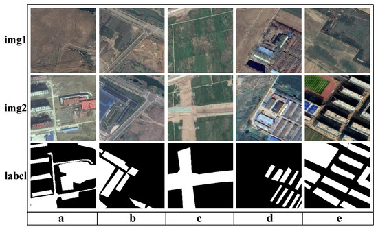 The BICD dataset is a remote sensing image change detection dataset suggested in our first work. It includes 3420 pairs of bi-temporal remote sensing images with 512 × 512 pixels. The number of image pairs divided into the training set, validation set, and test set are 2280, 570, and 570, respectively. This dataset spans the period from 2010 to 2019, and includes paired images from different regions of Eastern China at different times. The objects in the images include factories, farmlands, roads, and buildings, among other areas. The schematic diagram of the dataset is shown in Figure 5.