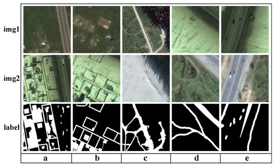 The CDD dataset is a publicly available remote sensing image change detection dataset. The original images of this dataset are composed of seven pairs of images with a resolution of 4750 × 2700 and four pairs of images with a resolution of 1900 × 1000. These 11 pairs of images are synchronously cropped into 16,000 pairs of 256 × 256 pixel images, with the number of image pairs divided into the training set, validation set, and test set being 10,000, 3000, and 3000, respectively. The schematic diagram of this dataset is shown in Figure 6.