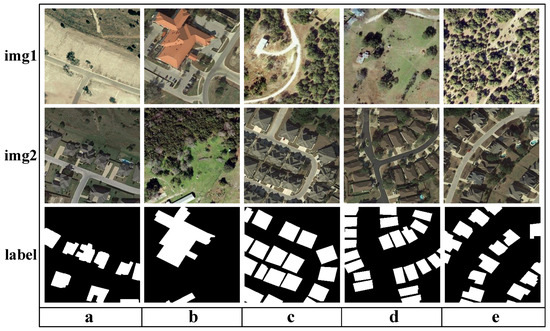LEVIR-CD is a large-scale building change detection dataset consisting of 637 pairs of 1024 × 1024 ultra-high resolution remote sensing images. It has a time span of 5–14 years, filmed between 2002 and 2018, focusing on major changes in architecture. The dual-temporal remote sensing images in the dataset come from 20 different areas in multiple cities in Texas, including villas, high-rise apartments, small garages, large warehouses, and other buildings, and consider seasonal and illumination changes. We crop the images into 256 × 256 pixel images, and the image logarithms are 7120, 1024 and 2048 for training set, validation set and test set, respectively. Its schematic diagram is shown in Figure 7.