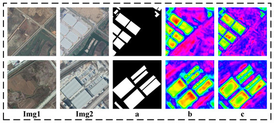 Figure 8. Heatmaps without and with FRM are compared. (Img1,Img2) are dual-temporal remote sensing images. (a) labels, (b) feature heatmap without FRM module in the network, (c) feature heatmap with FRM module added to the network.