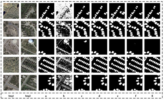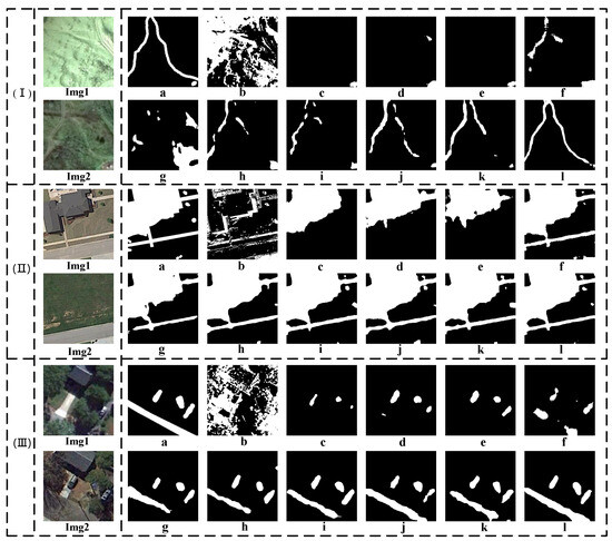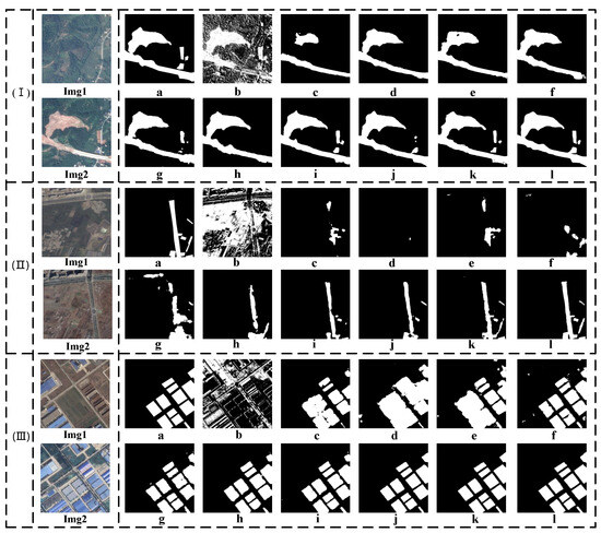 Figure 9 shows the comparison of prediction maps of different methods. We compare prediction maps on three different sets of bi-temporal remote sensing images to further illustrate the feasibility of our algorithm. Among them, a is the image label, and are prediction maps from various comparative algorithms. A comprehensive review of the three sets of comparative experiments reveals that the traditional PCA-Means algorithm performs the worst. Next is the FC series change detection algorithm, which can hardly recognize change areas and suffers from many missed detections and false alarms. The prediction maps of other deep learning-based algorithms are rather coarse, and their abilities to handle edge details and small targets are inferior. In contrast, the prediction map generated by our algorithm predicts the edge details of the change area and the changes in small targets very well. It can be said to differentiate between change and non-change areas in a targeted manner. Moreover, our algorithm’s prediction map is closer to the label and yields better prediction results.
