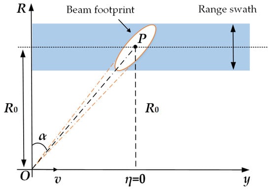 The geometry model is provided in Figure 1 for the high-squint airborne SAR system. The platform flies along the y-axis with a fixed velocity v. In this paper, the squint angle α is defined as the complementary angle between the line-of-sight direction and the flight path of the platform. Point P is an arbitrary target in the scene. R0 is the closest slant range between the sensor and the point target P, and η = 0 represents the corresponding azimuth time when the sensor passes the closest slant range R0. The range history R(η) of point target P can then be expressed as