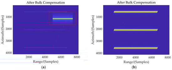 A simulation using the parameters listed in Table 1 is conducted to explain the effect of the bulk compensation preprocessing. Figure 3a,b depict the raw echo signals in the two-dimensional time domain after bulk compensation for central and non-central range cells, respectively. Three point targets are positioned at the same range gate with a constant azimuth interval of 1 km. The range position displacement is set to be 3 km for these three point targets, shown in Figure 3b. After bulk compensation preprocessing, the total RCM, Doppler phase and the range–azimuth coupling for the target positioned at the central range cell are removed as is shown in Figure 3a. The signal for the central point target has been zoomed into, shown by the red solid line box. However, the slight skew of the signal along the horizontal direction and the extension along the vertical direction indicate that there are still residual RCM and residual Doppler phase modulation, respectively, for targets located in non-central range cells. Moreover, this extension can also account for the residual cross-coupling. Therefore, it can be concluded from the above simulation results that the bulk compensation preprocessing can eliminate the total RCM of the reference range cell while maintaining the “azimuth-invariant” property and realize the range–azimuth decoupling processing.