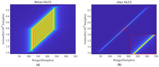 where r−1(∙) denotes the RIFFT operation. Figure 4a shows the range compressed result before NLCS processing in the range direction, which reflects the range pulse broadening due to the residual cross-coupling for the range marginal target. It can be observed from Section 3.2 that the variation of the range frequency modulation rate caused by the residual cross-coupling has been eliminated, which allows the signal to be consistently compressed by the range phase compensation in Section 3.3. The range compressed result after NLCS processing is depicted in Figure 4b, and the width of the range signal in the fast time domain is significantly reduced, which indicates that the window width of the correlation processing will be remarkably shortened for large squint angle cases. Additionally, Equation (32) shows that there is an additional range-variant cubic phase modulation of the rectangular window function in the range direction, which is also introduced by the residual cross-coupling. Different from the normal sinc function, the compressed range pulse r(τ, fη; R0) therefore has an asymmetric form as is shown in the partially enlarged view of Figure 4b, where obvious side-lobe energy asymmetry appears. This is the key point to distinguish the modified correlation processing from the traditional ones.