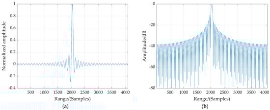 (a,b) Compressed range pulse g(τ, ϕn1) with normalized amplitude and dB-scaled normalized amplitude, respectively.
