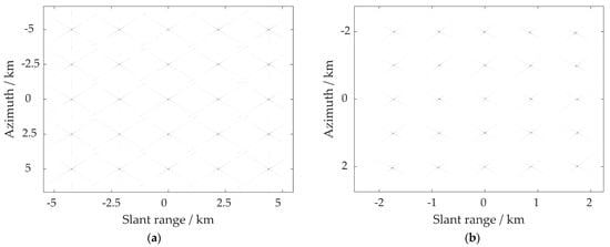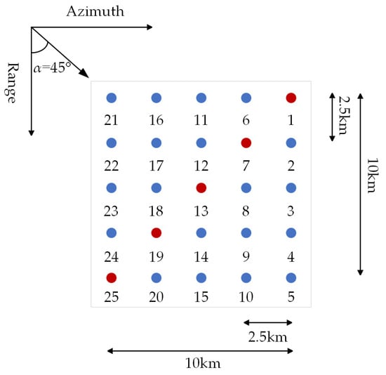 In order to validate the feasibility of the proposed MRDA for the high-squint airborne SAR imaging, point target simulations are carried out in this section employing the parameters listed in Table 1. As depicted in Figure 7, a 5 × 5 point matrix is evenly arranged in a square area of 10 km × 10 km in the ground scene, and the distance interval is 2.5 km both in range and azimuth directions. The squint angle α is set to be 45°. Rectangular antenna patterns are assumed in both these two directions.