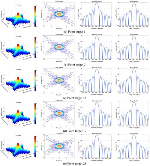 where β and β0 are look angles for central range cells and non-central range cells, respectively. Using the simulation parameters in Table 1, the relative range displacements for point targets 1 and 25 shown in Figure 9 can be obtained as −4999.46 m and 5000.32 m, respectively, and the corresponding ground range projection errors are 0.54 m and 0.32 m, respectively. Essentially, these projection errors are caused by the additional small linear phase modulation introduced by the NLCS operation in Section 3.2.