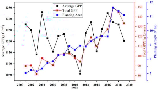 Changes in GPP from 2001 to 2019. The black dots, red dots, and blue dots linked by solid lines represent the average GPP, total GPP, and planting area, respectively.