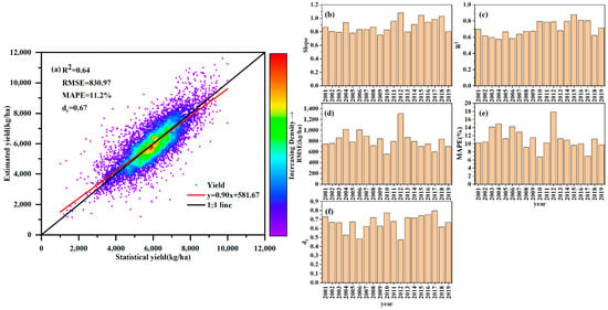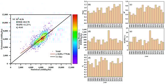 County-level comparison of the statistical and estimated yields: (a) shows the model’s overall performance and (b–f) display the correlation coefficients (slope, R2, RMSE, MAPE, and ) between the statistics and estimates on the yield from 2001 to 2019. All the coefficients in the figure passed the significance test at the 0.01 confidence level.