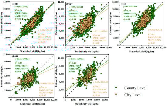 Scatter plots on the statistics and estimated yield at the county and city level: (a–e) show the relationship between the statistics and estimates on the yield during 2001–2019 in HB, HN, SD, AH, and JS provinces, respectively. The green and yellow dots represent the county-level and city-level yield, respectively. Green and yellow represent regression lines at the county and city levels, respectively. Dotted line indicates 1:1 line.