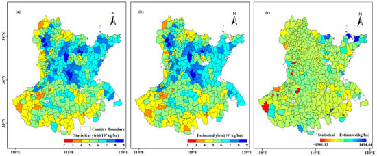 Spatial distribution of the county-level statistics and estimates for the mean maize yield from 2001 to 2019. Here, (a–c) show the statistical, estimated yields for maize and the difference between them, respectively.