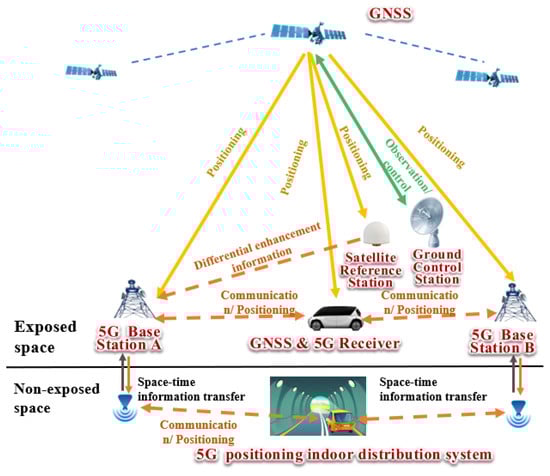 A spatio-temporal network is a strategic symbol of comprehensive national strength, and GNSS and mobile communication networks are important components of the spatio-temporal network system. The global location-based service market size will grow from USD 70.27 billion in 2022 to USD 88.42 billion in 2023, with a compound annual growth rate of 25.8% []. The promotion of the deep integration of GNSS system and mobile communication network, the establishment of a new type of ubiquitous, reliable, and integrated location service system platform, and the formation of a highly reliable spatio-temporal network have become an inevitable trend. In recent years, many countries have carried out a major deployment of space-time service systems using GNSS, next-generation mobile communications, and big data to strengthen comprehensive information service capabilities and comprehensively improve the level of the space-time infrastructure’s development. Building a highly dependable spatio-temporal network is urgently needed to solve the problems of network heterogeneity, data-heterogeneity fusion, and trusted positioning under the spatio-temporal network architecture. The scenario of GNSS and 5G hybrid positioning is shown in Figure 1.