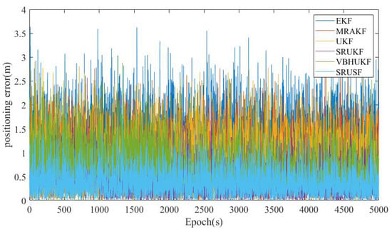 Positioning error comparison of EKF, MRAKF, UKF, SRUKF, VBHUKF, and the proposed SRUSF method.