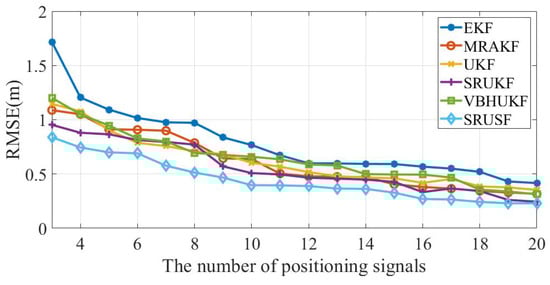 It can be seen that when the number of positioning signals received by the receiver increases from 3 to 10, the positioning errors of each fusion algorithm are significantly reduced. When the number of available positioning signals is further increased, the positioning accuracy is not greatly improved. Compared with the methods EKF, MRAKF, UKF, SRUKF, VBHUKF, and SRUSF, the performance of the proposed SRUSF algorithm is close to that of other methods, but the performance of the SRUSF algorithm is still better than the other methods, showing high numerical stability.