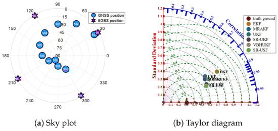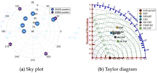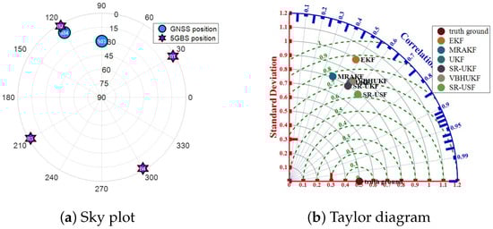 In order to further prove the superiority of the SRUSF algorithm proposed in this paper, three typical GNSS and 5G joint positioning scenarios are considered in this section, including the slight occlusion of satellite signals, the moderate occlusion of satellite signals, and the severe occlusion of satellite signals. We simulate different numbers of visible satellites and present the performance of various positioning algorithms in different environments. The 5G positioning base station can be arranged according to the requirements, assuming that the 5G base station is evenly distributed around the positioning receiver. An excessive number of base stations is not conducive to observing the impact of changes in the number of GNSS satellites on the positioning accuracy, so the number of 5G positioning base stations is set to four. We generate three sets of observation data with different accuracy levels, and the mean of the real positioning results is set to 0, and STDs are set to 0.5, 0.4, and 0.3 m. In the three typical scenarios, the sky plot and the Taylor diagram are given.