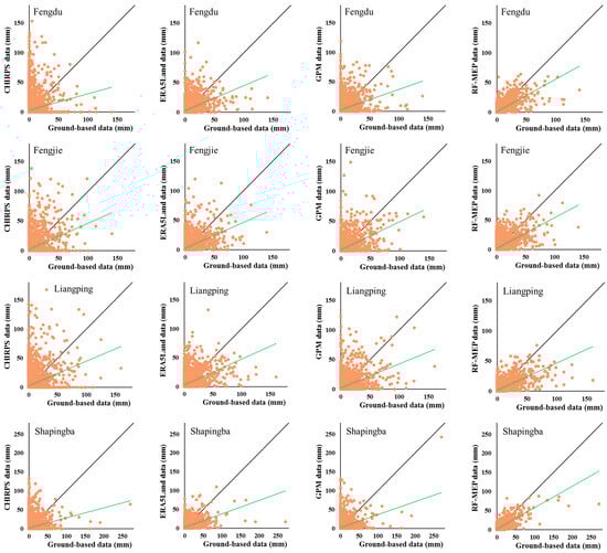 Scatterplots illustrating daily precipitation comparisons between the three original gridded precipitation products (CHIRPS, ERA5Land, and GPM) and merged precipitation products using the RF-MEP approach against the ground measurements for the four testing stations from 2001 to 2017.