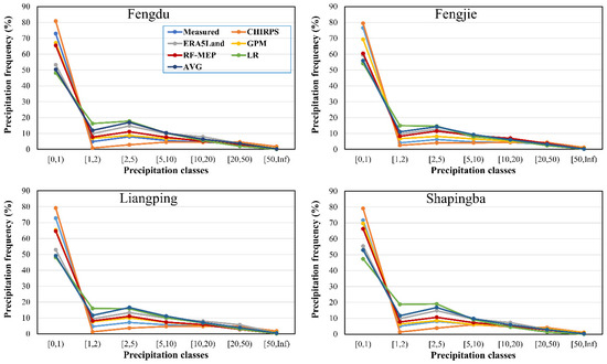 Figure 4 shows the occurrence frequency of daily precipitation with seven different intensity ranges for the three existing gridded precipitation products (CHIRPS, ERA5-Land, and GPM), the merged precipitation estimates from the three methods (RF-MEP, LR, and AVG), and ground measurements at each of the four test stations (Fengdu, Fengjie, Liangping, and Shapingba). All four test stations show that more than 70% of daily precipitation from the ground measurements fall in the intensity of 0–1 mm/day. For this intensity range, CHIRPS shows consistent overestimation (close to 80%), while all other products and the merged precipitation datasets from three methods (RF-MEP, LR, and AVG) show consistent underestimation (all lower than 70%). CHIRPS shows large underestimation for the intensity ranges (1–5 mm/day), while the opposite is found for the ERA5-Land.